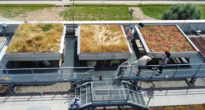 Suivi en continu du poids de six toitures végétalisées ainsi que les débits en sortie de ces toitures. Chaque toiture est indépendante, mesure 9m² (3*3) et permet d'estimer l'évolution de l'évapotranspiration. Les substrats sont modifiables en fonction des besoins.